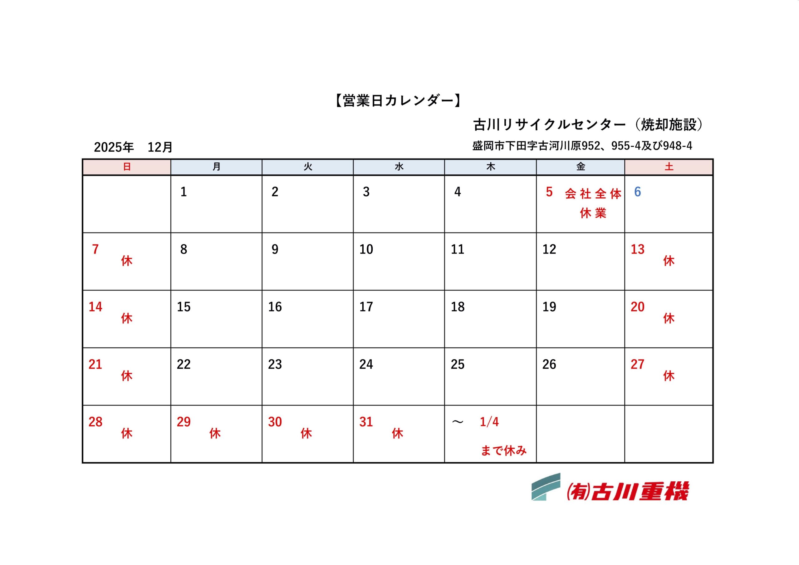 古川リサイクルセンター営業カレンダー 2025.12.1 古川リサイクルセンターの営業カレンダー 12月 各施設案内はこちら 姫神リサイクルセンター営業カレンダー 前の記事 事務所 営業カレンダー 次の記事