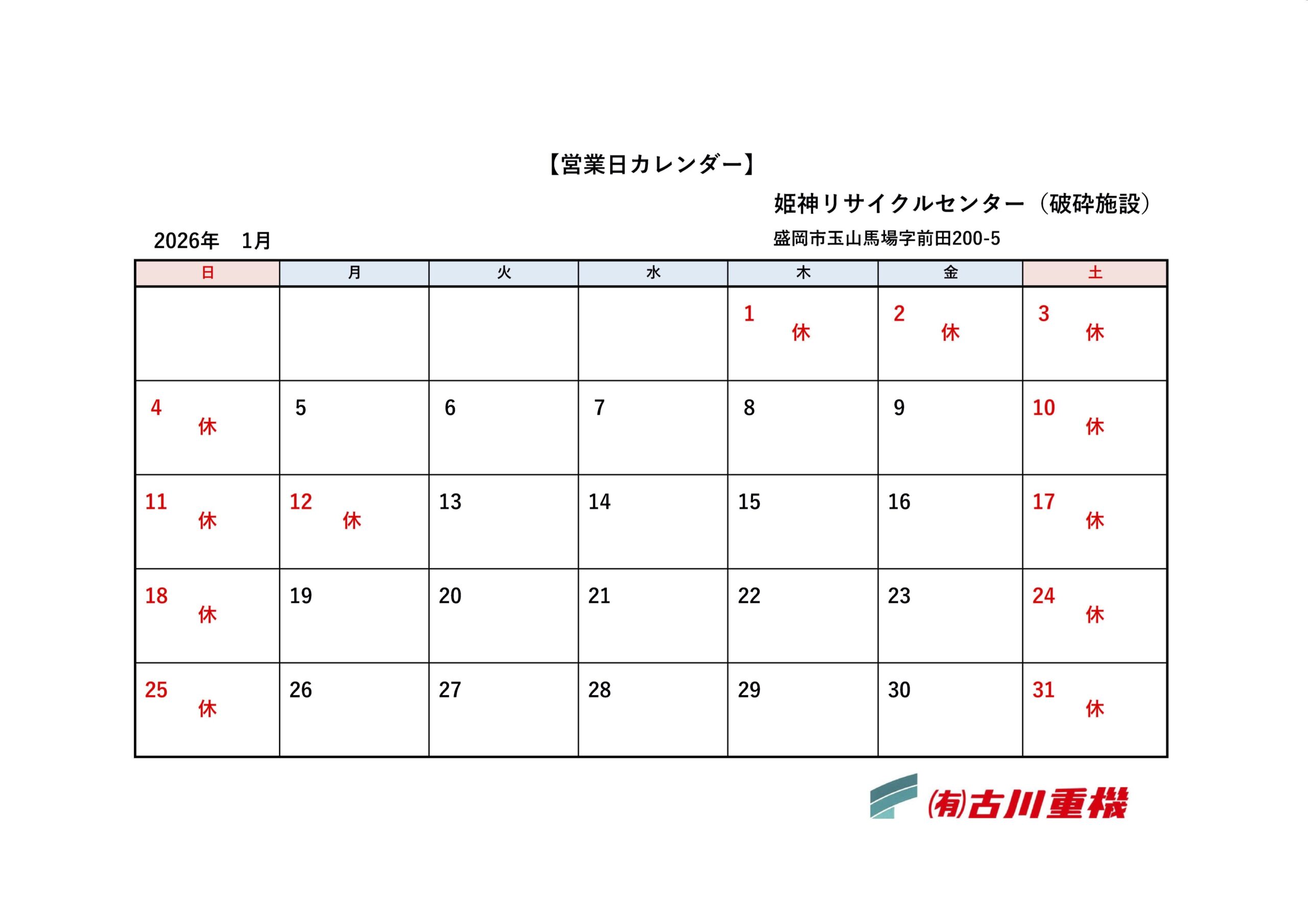 姫神リサイクルセンター営業カレンダー 2026.01.6 姫神リサイクルセンターの営業カレンダー 2026年1月 各施設案内はこちら ✨ホームページリニューアルのお知らせ✨ 前の記事 古川リサイクルセンター営業カレンダー 次の記事