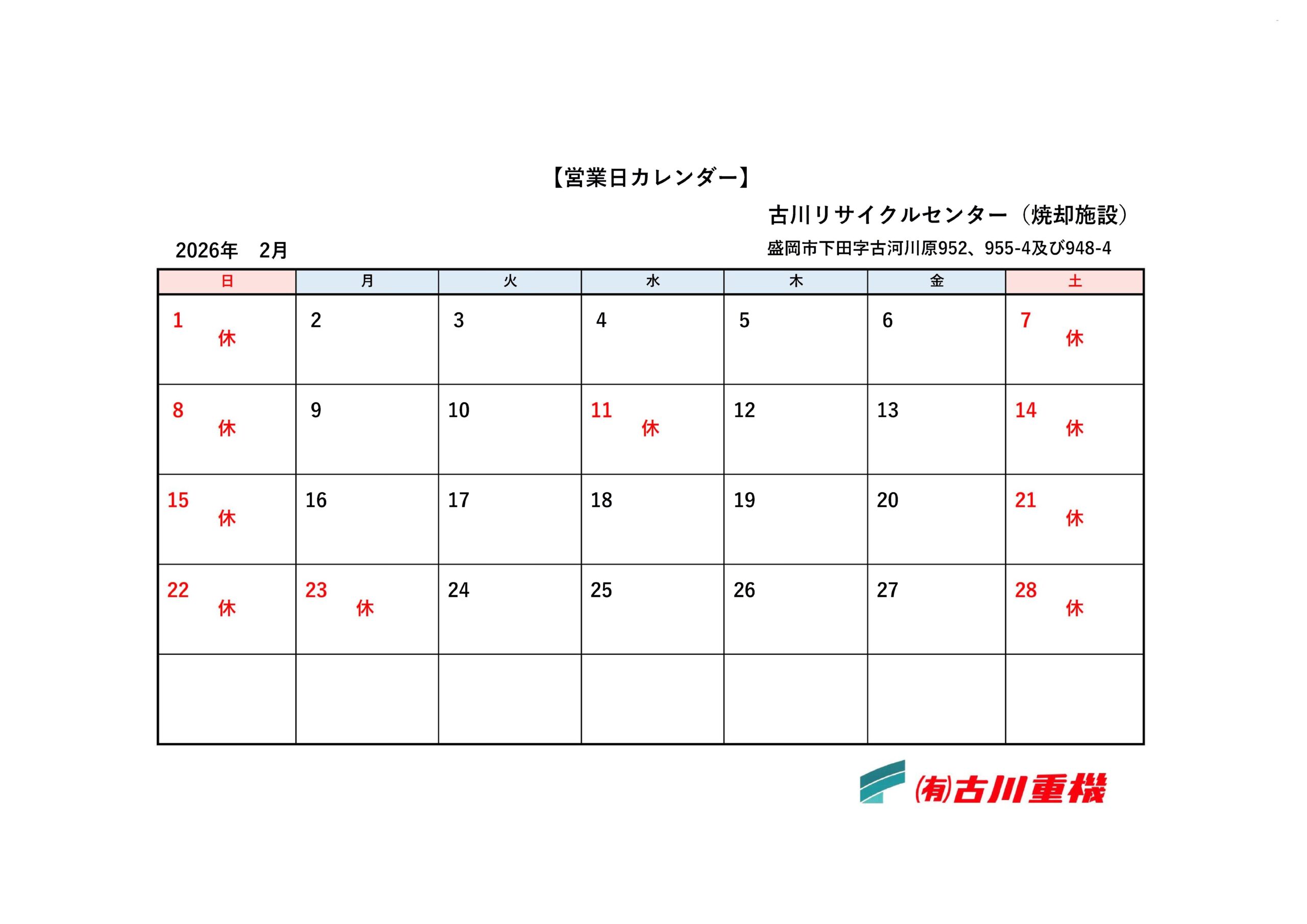 古川リサイクルセンター 営業カレンダー2月 2026.01.30 古川リサイクルセンター 営業カレンダー 2026年2月 ✨ホームページリニューアルのお知らせ✨ 前の記事 姫神リサイクルセンター 営業カレンダー2月 次の記事