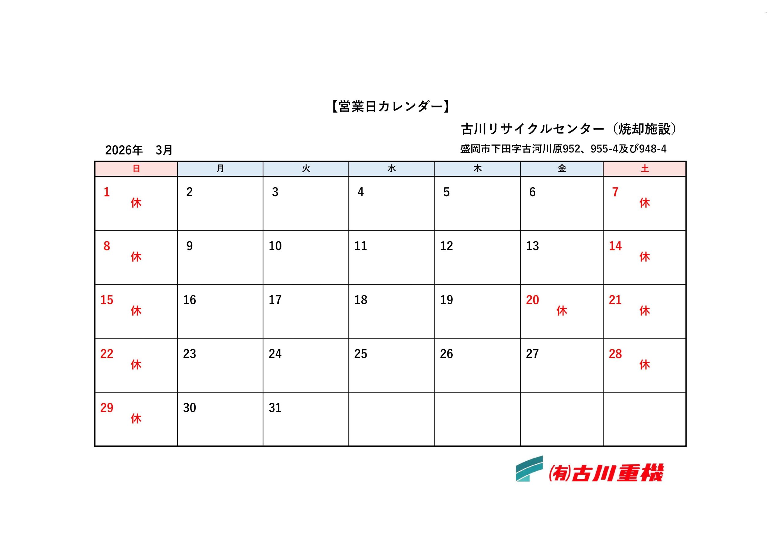 古川リサイクルセンター 営業カレンダー3月